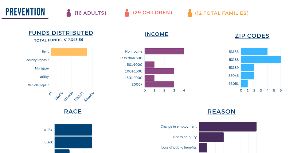 Following the guidelines of the Wisconsin State Division of Energy, Housing and Community Resources we have been providing rent assistance based on the greatest need. Their guidelines require that every family seeking assistance participate in an assessment and are then added to a list called Coordinated Entry (CE). Coordinated Entry prioritizes those with the most needs and moves them to the top of the list. Currently there are 62 families on the list. Even though using this list has allowed us to better identify the needs of families in Waukesha County, it is not comprehensive. There are a few agencies who provide rent assistance without the prioritization list, therefore we know that there are many more than 62 families who need assistance.